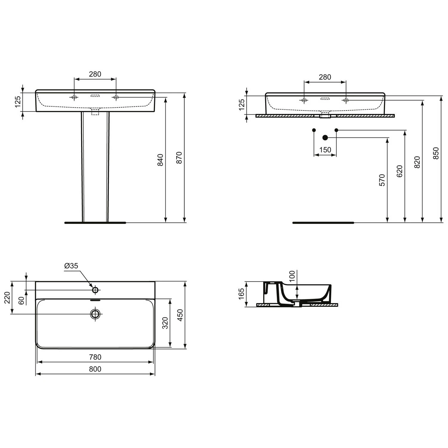 Ideal Standard Conca Waschtisch 80 cm, 1 Hahnloch, mit Überlauf, geschliffen