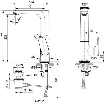 Schwenkbereicher vom Auslauf: 70 Grad, 120 Grad, 360 Grad